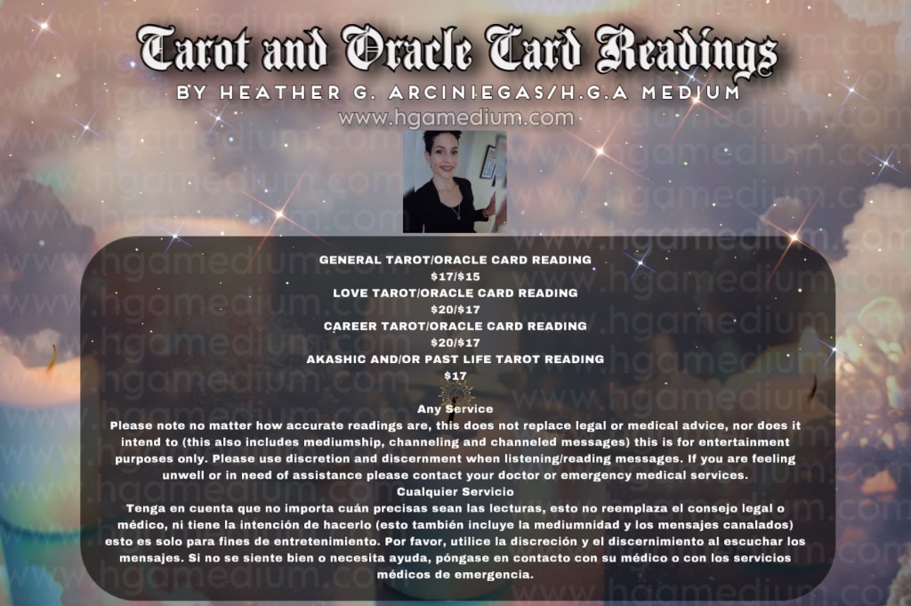 Please note no matter how accurate readings are, this does not replace legal or medical advice, nor does it intend to (this also includes mediumship, channeling and channeled messages) this is for entertainment purposes only. Please use discretion and discernment when listening/reading messages. If you are feeling unwell or in need of assistance please contact your doctor or emergency medical services.