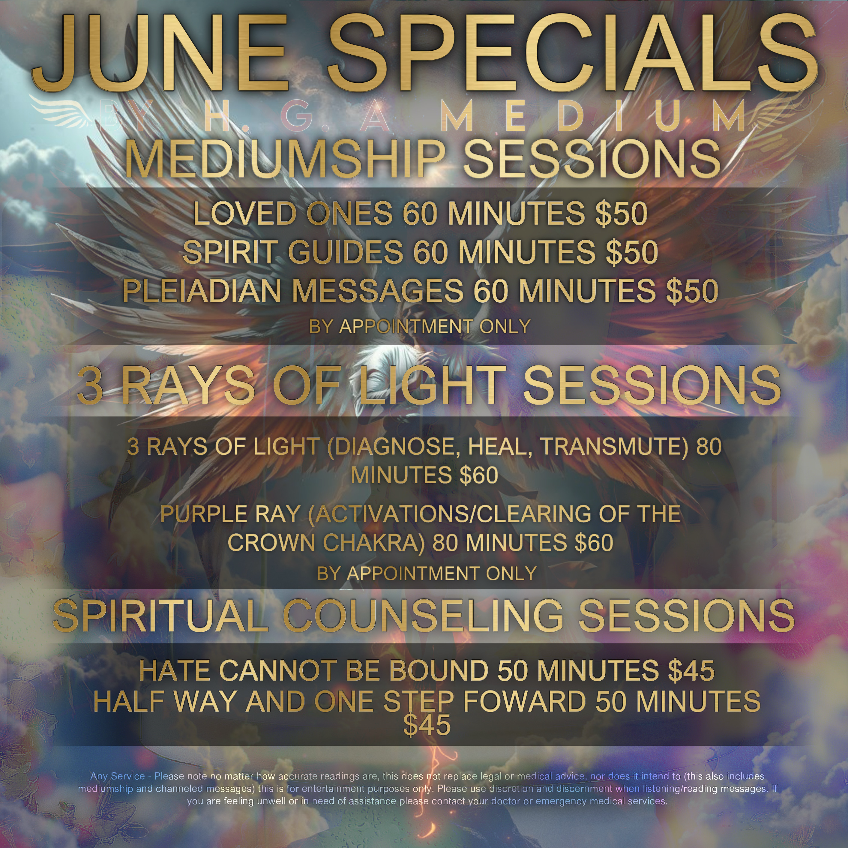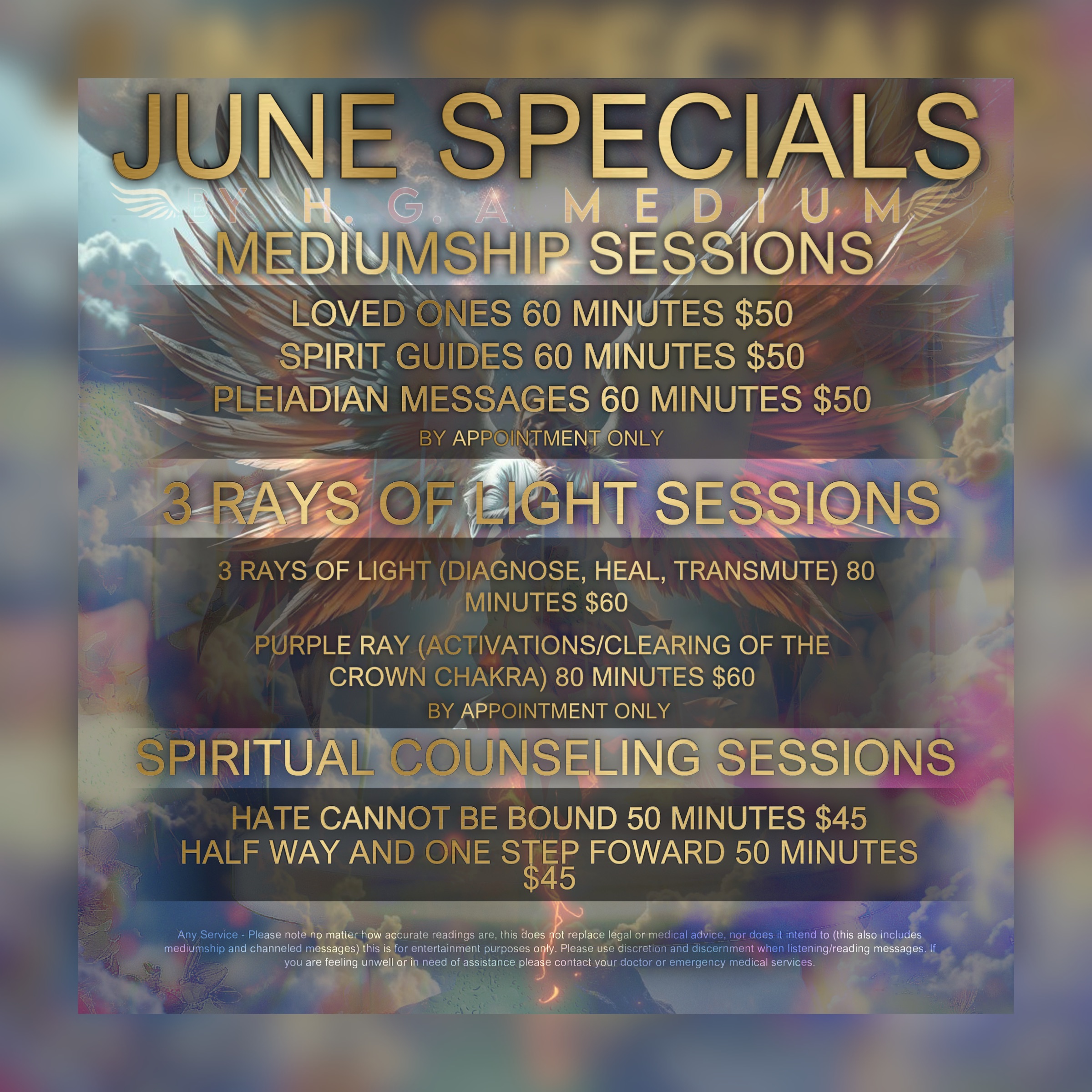 Como ministro ordenado, todas las sesiones de asesoramiento incorporan la creencia de la existencia del Creador, así como la comprensión de todos los ámbitos de la vida humana. Para el mes de Junio, el enfoque principal es la transformación y superar los conflictos repetitivos. El servicio temporal HATE CANNOT BE BOUND es un servicio que dará a los clientes la oportunidad de abordar cualquier asunto que les haya dado angustia o tristeza perpetua con una mano espiritual. Las discusiones con respecto a la transmutación de la ira y la elevación de la perspectiva del yo es la misión principal de esta forma de consejo espiritual.
