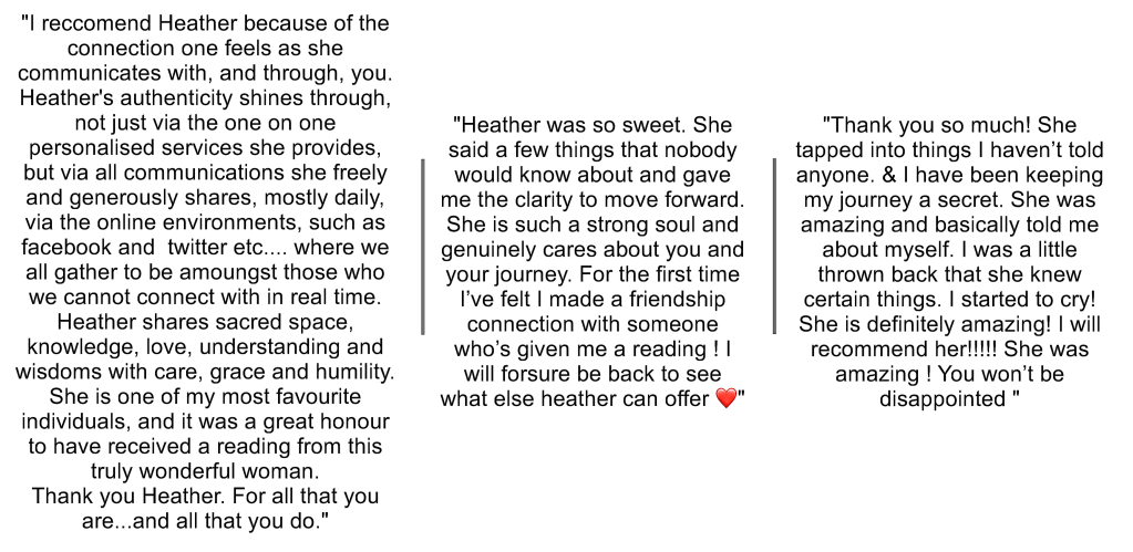 Heather puede transmitir mensajes de seres queridos y seres de alta vibración/frecuencia (arcángeles, dioses, diosas, seres estelares y maestros ascendidos) y puede proporcionar orientación para ayudar a otros a iniciar cambios positivos en sus vidas, así como cambios dentro de sus prácticas espirituales. Ya sea que esté buscando algo de claridad en una situación difícil o necesite un facilitador que lo ayude a transformar su vida, en busca de información/consejo espiritual o simplemente tenga curiosidad, Heather siempre está aquí para ayudarlo.