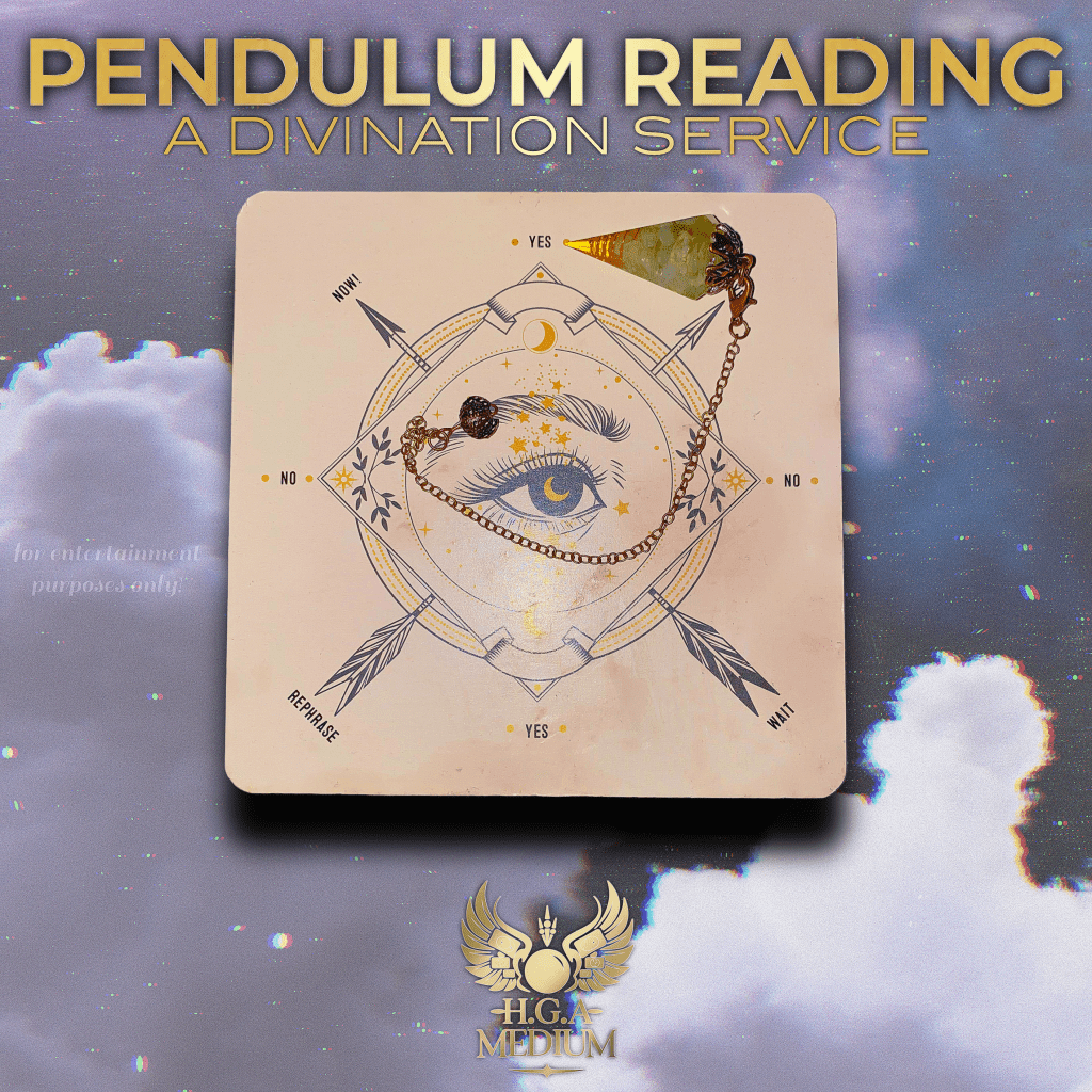 Dowsing is a form of divination that many have seen depicted in popular media pertaining to the paranormal apart from tarot. You may think of the famous dowsing rods that appear in paranormal investigation series on television. Pendulums are a form of dowsing that many practitioners have used over the years dating back to the Ancient Greeks and Ancient Romans. A tool famous for answering “yes” or “no” questions, pendulums can also be used to communicate with spirits very much like spirit boards (Ouija board) and can be utilized in spell-craft as well as psychic self-defense. Know that pendulums can be used for healing as well as a tool for diagnosis and there are many practitioners who utilize them for that purpose. Receive a pendulum reading to achieve clear cut answers pertaining to any type of question. Answers can be recorded and sent or the pendulum reading can be performed via video call. Clients may also choose the text & photo option depicted below which permits a faster response time and service.